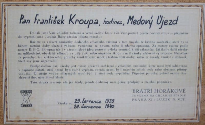 Vedle pípy visí záruční list pro chlazení, které v roce 1939 dodali BRATŘI HORÁKOVÉ. Záruční doba byla stanovena na jeden rok. Chlazení slouží ale až do dnešního dne, jen letos jsme provedli výměnu chladícího agregátu za nový.